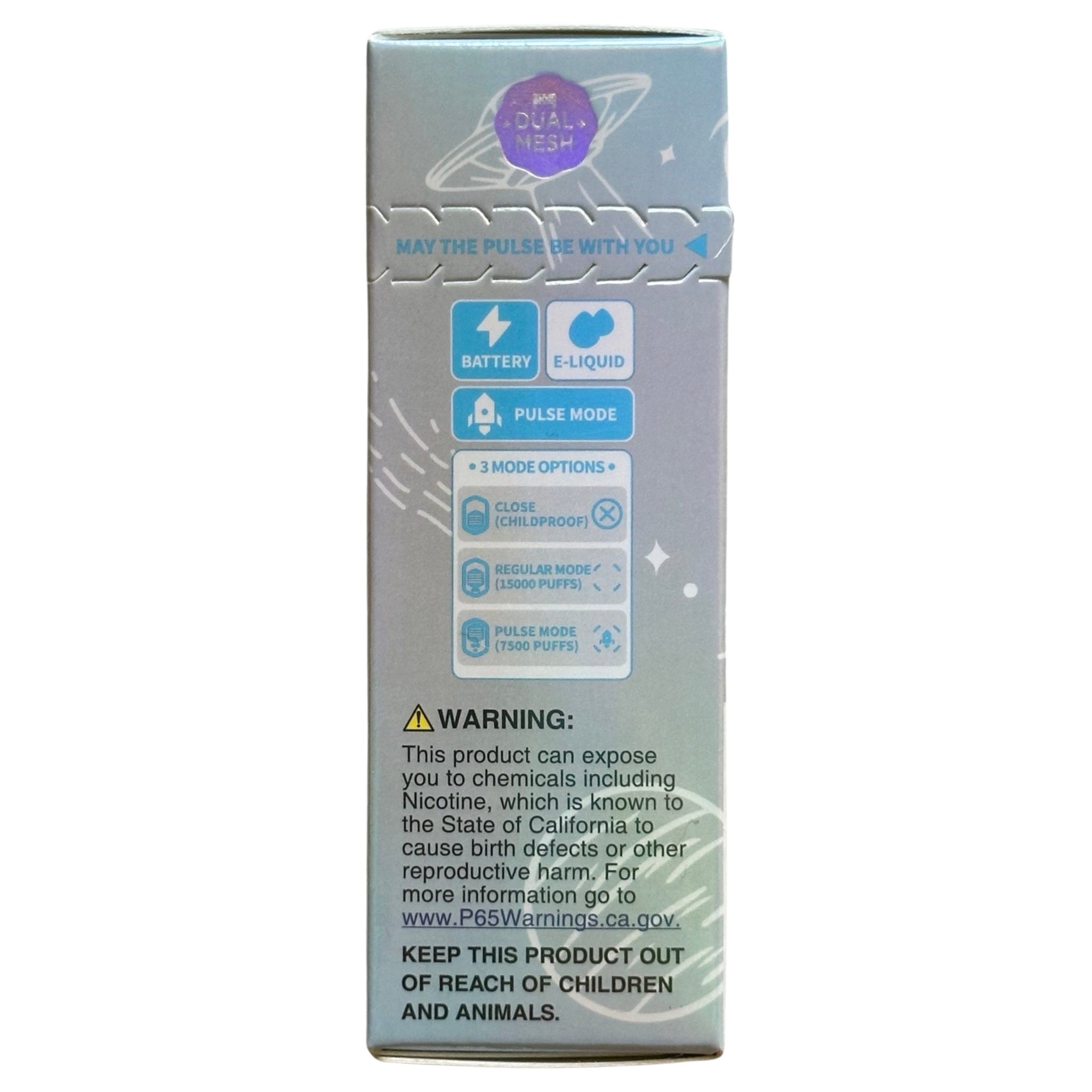 - Three modes: Close Mode (childproof safety), Pulse Mode (up to 7500 puffs), Regular Mode (up to 15000 puffs)