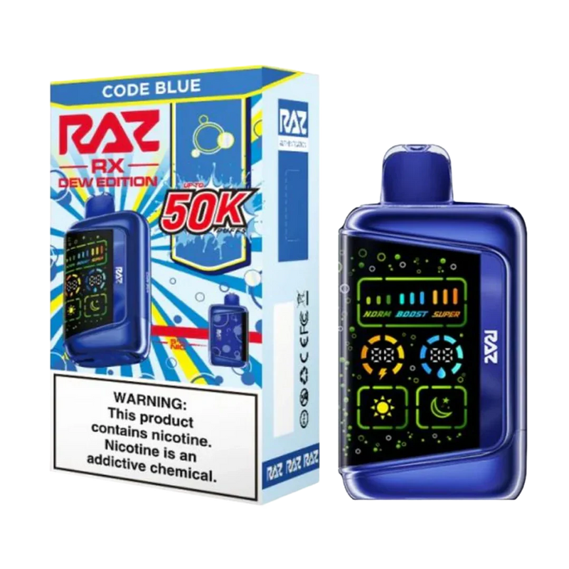 In short, Code Blue – RAZ RX50K delivers lasting longevity, customizable power, and a memorable blue raspberry + soda flavor profile, all in a sleek, user-friendly package.