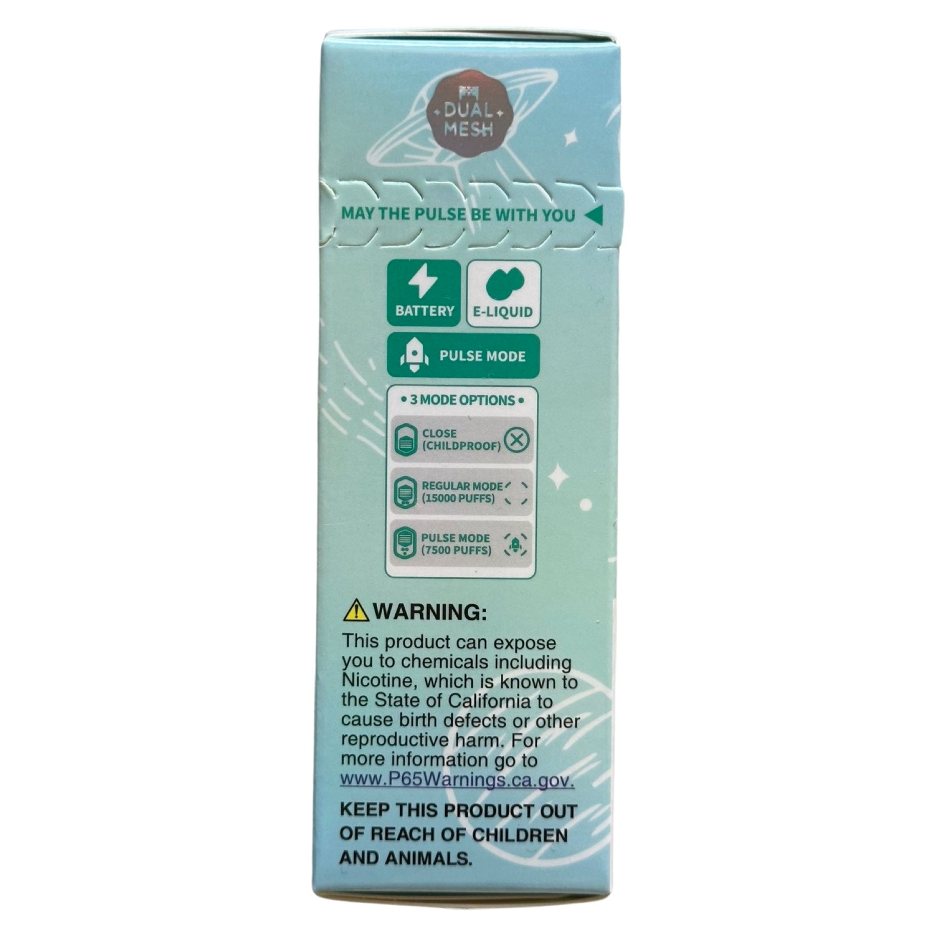 - Mode options: Childproof Close Mode, Pulse Mode (up to 7500 puffs), Regular Mode (up to 15000 puffs).